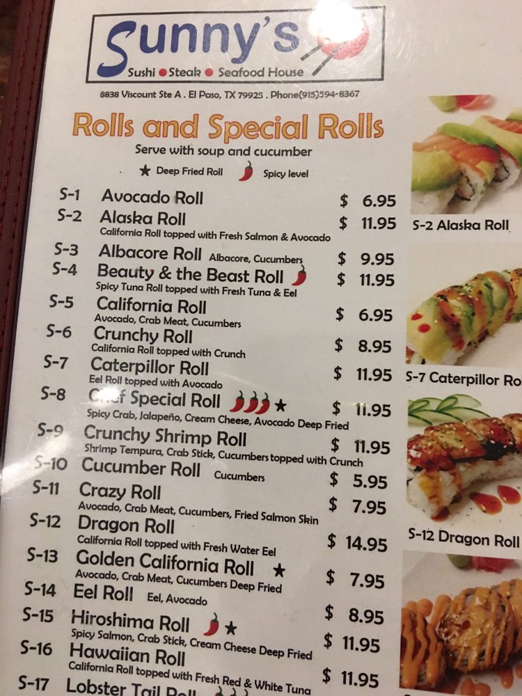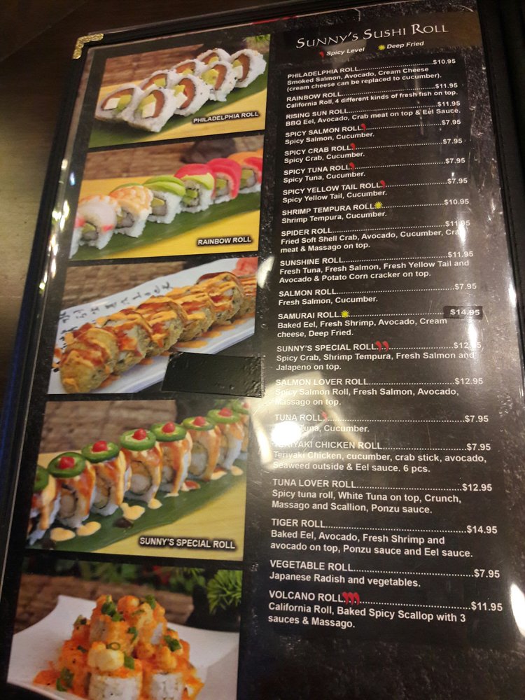 Introducing the menu at Sunny's Sushi, located in El Paso, TX, offers a variety of appetizers, including cold salads like House Salad and Seaweed Salad, and hot options like Chicken Salad and Gyoza. Rice, noodle, and soup dishes such as Fried Noodle with Spicy Bulgogi and Spicy Beef Noodle Soup are also available. Customers have praised the attentive service and delicious food, with options for both sushi lovers and non-sushi enthusiasts. Overall, Sunny's Sushi provides a casual yet trendy dining experience with a range of offerings catering to different tastes. Whether you're looking for a quick lunch, a group dinner, or a special occasion, Sunny's Sushi has something for everyone to enjoy. So come and experience the flavorful dishes and welcoming atmosphere at Sunny's Sushi today!